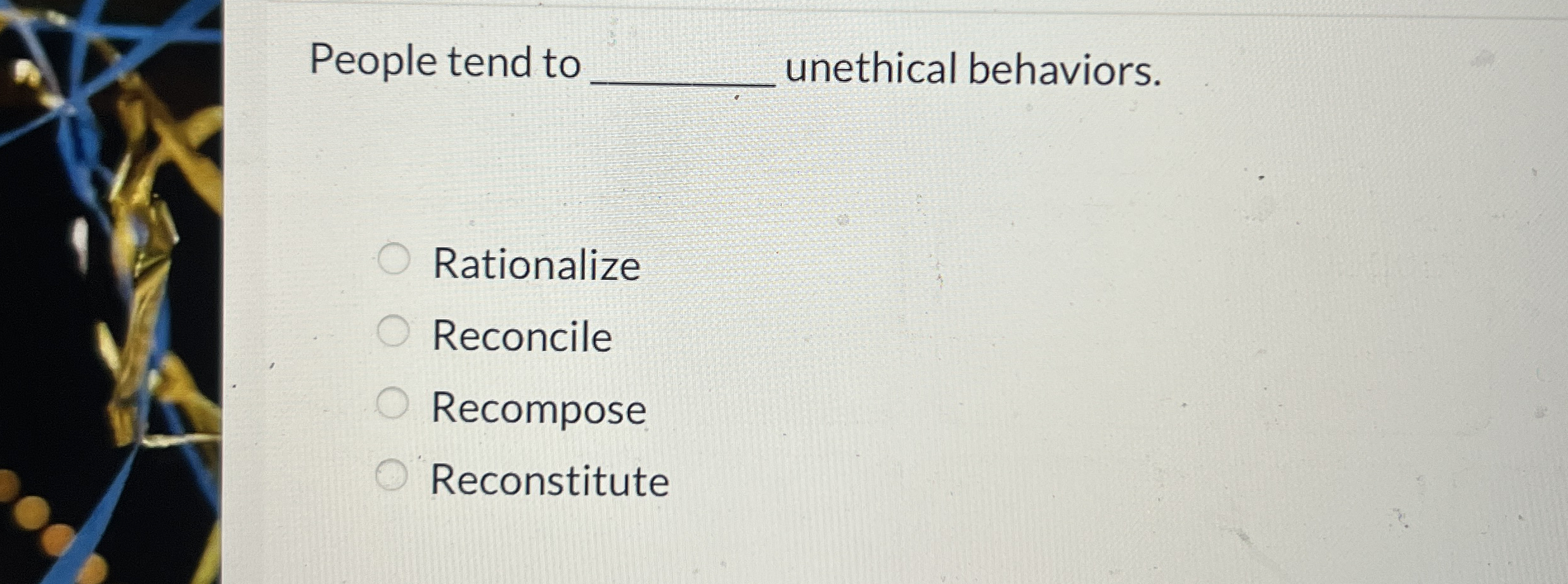 People tend tounethical behaviors.RationalizeReconcileRecomposeReconstitute- Here’s the best way to solve it.Solution