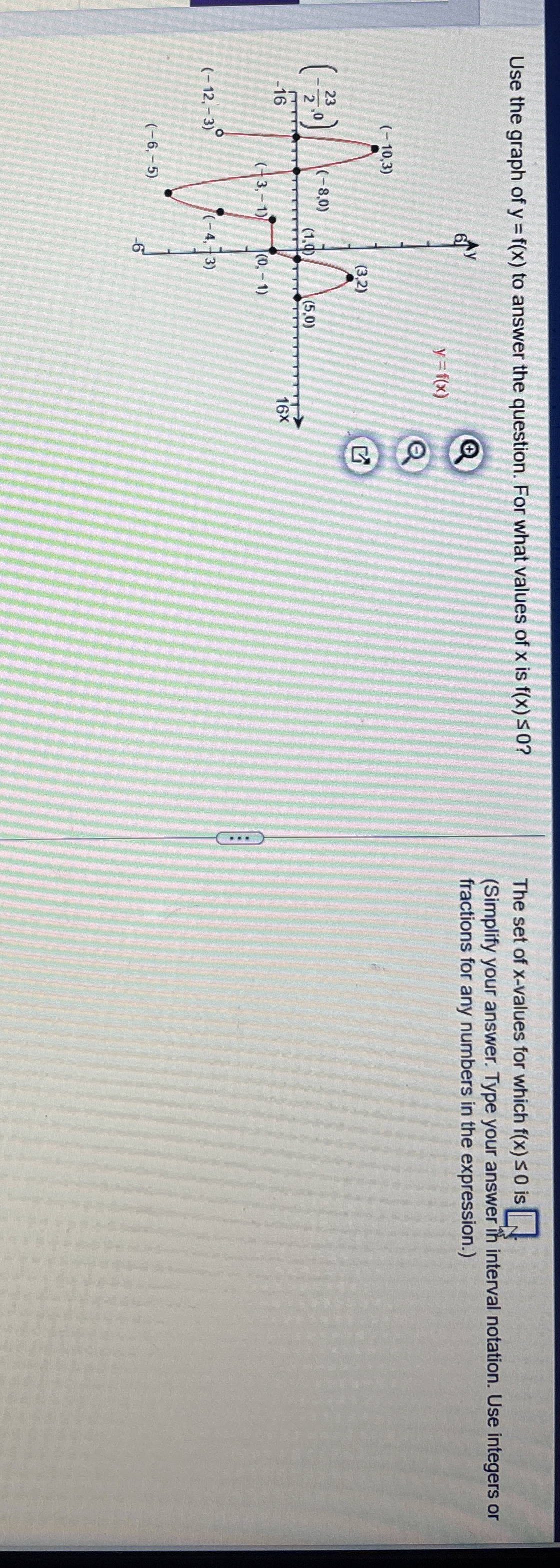 Question: Use the graph of y=f(x) to answer the question. For what values of x is f(x)≤0 ?